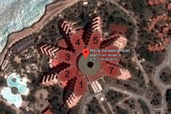 The photo above shows the unique design of Melia Varedero. It consists of a central open atrium with the rooms in 7 halls radiating from the atrium like petals on a flower. With this design a large number of rooms have ocean views. When we were at Melia our family was in the 3rd hall.